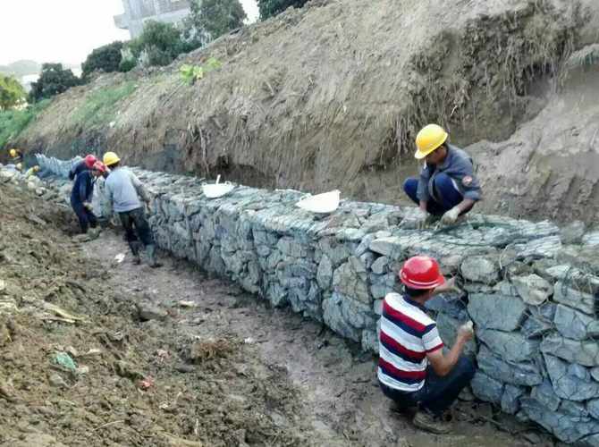 格賓網(wǎng)也稱重型六角網(wǎng)、擰花網(wǎng)、石籠網(wǎng)、三絞節(jié)機(jī)編網(wǎng)、雙絞格網(wǎng)是金屬線材編織的角形網(wǎng)(六角網(wǎng))制成的網(wǎng)箱,使用的金屬線徑是根據(jù)六角形的大小而不同.如果是金屬鍍層的金屬線六角形,則使用線徑為2.0mm到4.0mm的金屬線,如果是PVC包覆的金屬線編織的六角網(wǎng),則使用外徑為3.0mm到4.5mm的PVC(金屬)線.外框邊緣的線則使用比六角網(wǎng)線粗一號(hào)的線。格賓網(wǎng)是由經(jīng)表面防蝕處理的低碳鋼絲用機(jī)械編織的雙鉸六角形柔性金屬網(wǎng)經(jīng)剪裁,編邊和組合后制成的各種規(guī)格的網(wǎng)籠。