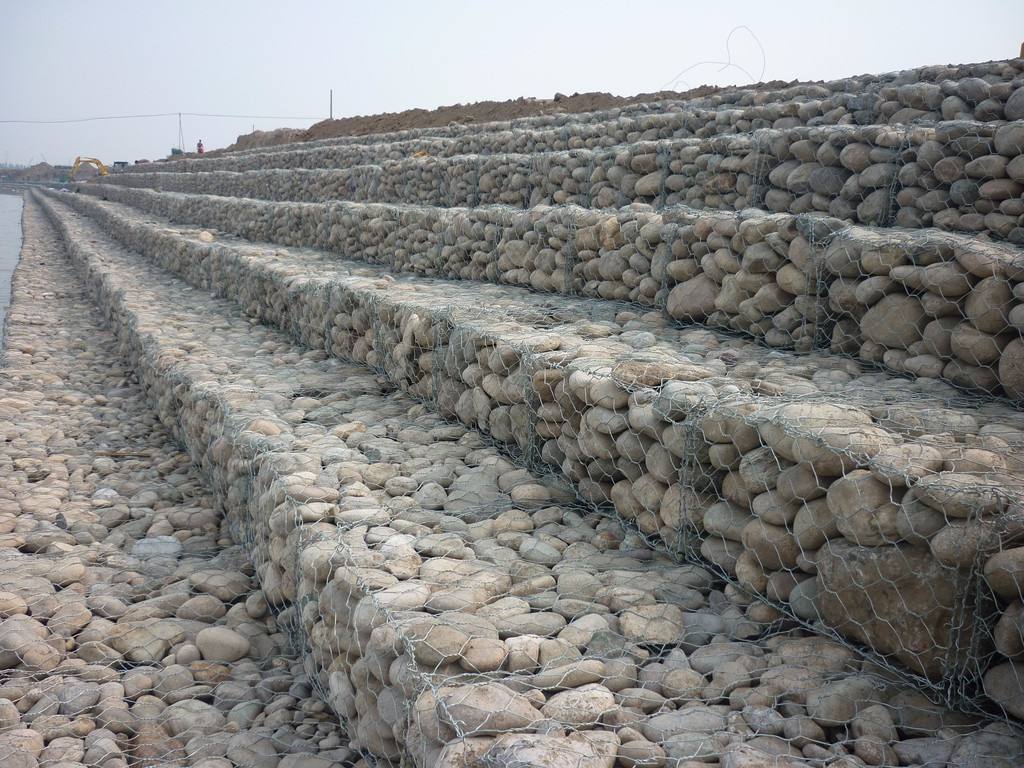 4、使用石籠網(wǎng)具有施工快,當(dāng)基礎(chǔ)開挖完成后石籠建筑物即可一次建成。施工中還能避免在河道和海灘建筑圍堰,減少排水費用。在無水地區(qū)施工,經(jīng)過鋪網(wǎng)、填石和連接加固即可完成。在江河沿海地區(qū)進行水下施工時,可事先裝好石籠網(wǎng),然后吊裝安放就位,或者用船運至預(yù)定地點拋石就位截流工程可采用此法。