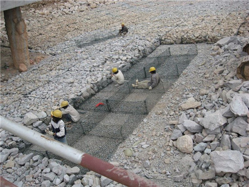 2 雷諾護(hù)墊施工過程應(yīng)符合如下要求: 雷諾護(hù)墊在鋪設(shè)前需進(jìn)行組裝 嚴(yán)格按照相關(guān)要求對(duì)護(hù)墊進(jìn)行展開、對(duì)沒有折痕的隔板、邊板用人工折、 用 15cm 鋼絲絞合隔板與邊板交疊的地方 組裝好的雷諾護(hù)墊形狀規(guī)則、線條直順、絞合點(diǎn)牢固。 除極小的溝渠外護(hù)墊長(zhǎng)邊應(yīng)與坡面方向垂直; 當(dāng)護(hù)墊放在陡坡上(坡比大于 1:1.5) ,需用硬木樁在坡頂進(jìn)行 固定木樁入土深度至少應(yīng) 25cm,也可采用現(xiàn)澆混凝土平臺(tái)進(jìn)行固定;所有護(hù)墊必需緊靠、整齊、并且用短鋼絲固定相鄰護(hù)墊。 雷諾護(hù)墊的石料填充應(yīng)滿足以下要求 \裝填雷諾護(hù)墊所用的石料尺寸應(yīng)在 75mm~150mm; 當(dāng)使用大尺寸石料填充時(shí),應(yīng)根據(jù)雷諾護(hù)墊的高度確保至少裝填 兩層石料;石料裝填必需飽滿,并且達(dá)到設(shè)計(jì)厚度,特別注意每個(gè)方框的四 個(gè)角點(diǎn)以及坡上隔板上下兩端石料的裝填; 表面需要用人工進(jìn)行清平,將石料較為平整的面朝上,確保小到 每一個(gè)小方框,大到整個(gè)坡面,裝填完以后都在一個(gè)平面上,不存 在凸出和凹陷現(xiàn)象。