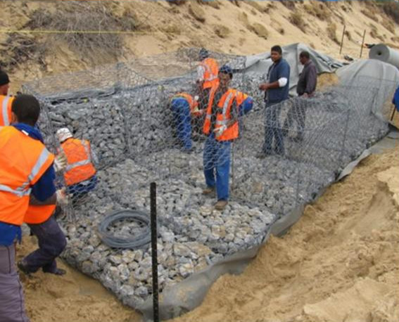 格賓網(wǎng)是金屬線材編織的角形網(wǎng)(六角網(wǎng))制成的網(wǎng)箱,使用的金屬線徑是根據(jù)六角形的大小而不同.如果是金屬鍍層的金屬線,則使用線徑為2.0mm到4.0mm的金屬線,如果是PVC包覆的金屬線編織的六角網(wǎng),則使用外徑為3.0mm到4.5mm的PVC(金屬)線.外框邊緣的線則使用比六角網(wǎng)線粗一號(hào)的線。低于50公分了統(tǒng)稱墊,或是護(hù)墊,高于50公分的稱為籠。