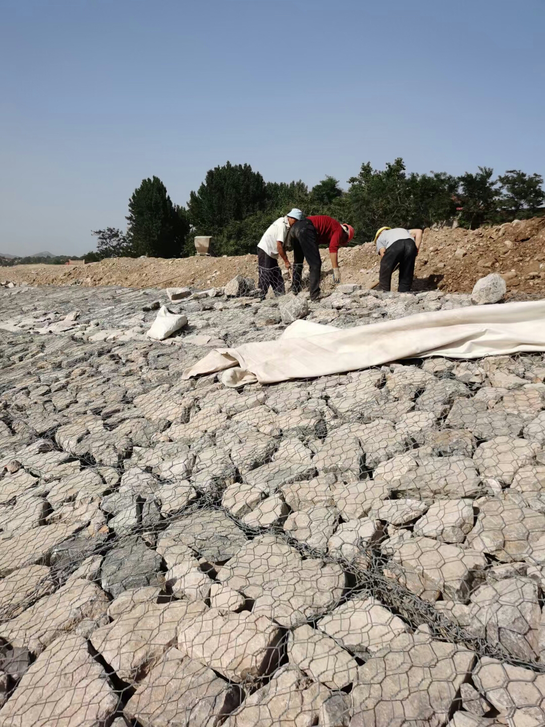 (3)將組長(zhǎng)好的籠體安裝在所需的位置上,并與相鄰的籠體綁扎連接,將準(zhǔn)備好的石塊或卵石填入籠中,要作適當(dāng)?shù)拇a排,以達(dá)到較高的密實(shí)度,石塊直徑一般須大于網(wǎng)目的兩倍,石塊要選用抗風(fēng)化能力強(qiáng)的石料。用拉筋來(lái)保持籠體形狀的規(guī)整,拉筋間距一般在300mm左右。