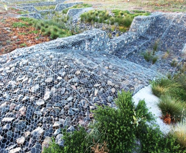 固濱籠是由高抗腐蝕、高強(qiáng)度、具有延展性的低碳鋼絲或許包覆PVC的以上鋼絲運(yùn)用機(jī)械織造而成,依據(jù)ASTM A 975和EN10223規(guī)范,所運(yùn)用的低碳鋼絲直徑依據(jù)工程設(shè)計(jì)需求而不一樣。通常介于2.0-4.0mm之間,鋼絲的抗拉強(qiáng)度不少于38kg/m2,金屬鍍層分量通常高于245g/m2格賓網(wǎng)片的邊際線直徑通常要大于網(wǎng)線直徑。其雙線絞合有些的長(zhǎng)度不得小于50mm.以確保絞合有些鋼絲的金屬鍍層和PVC鍍層不受損壞。