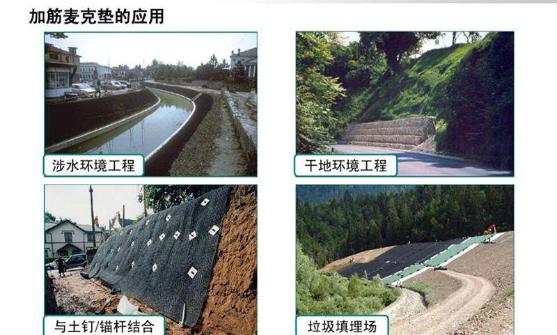 加筋麥克墊是一種坡面輕型防護(hù)材料,可用于水利、航道、公路、鐵路、礦業(yè)、地災(zāi)、市政以及環(huán)境工程中的岸坡防護(hù),主要作用在于固定表層土防止水土流失,并且加速綠化。也可以用于流速較低的河道岸坡防護(hù)。