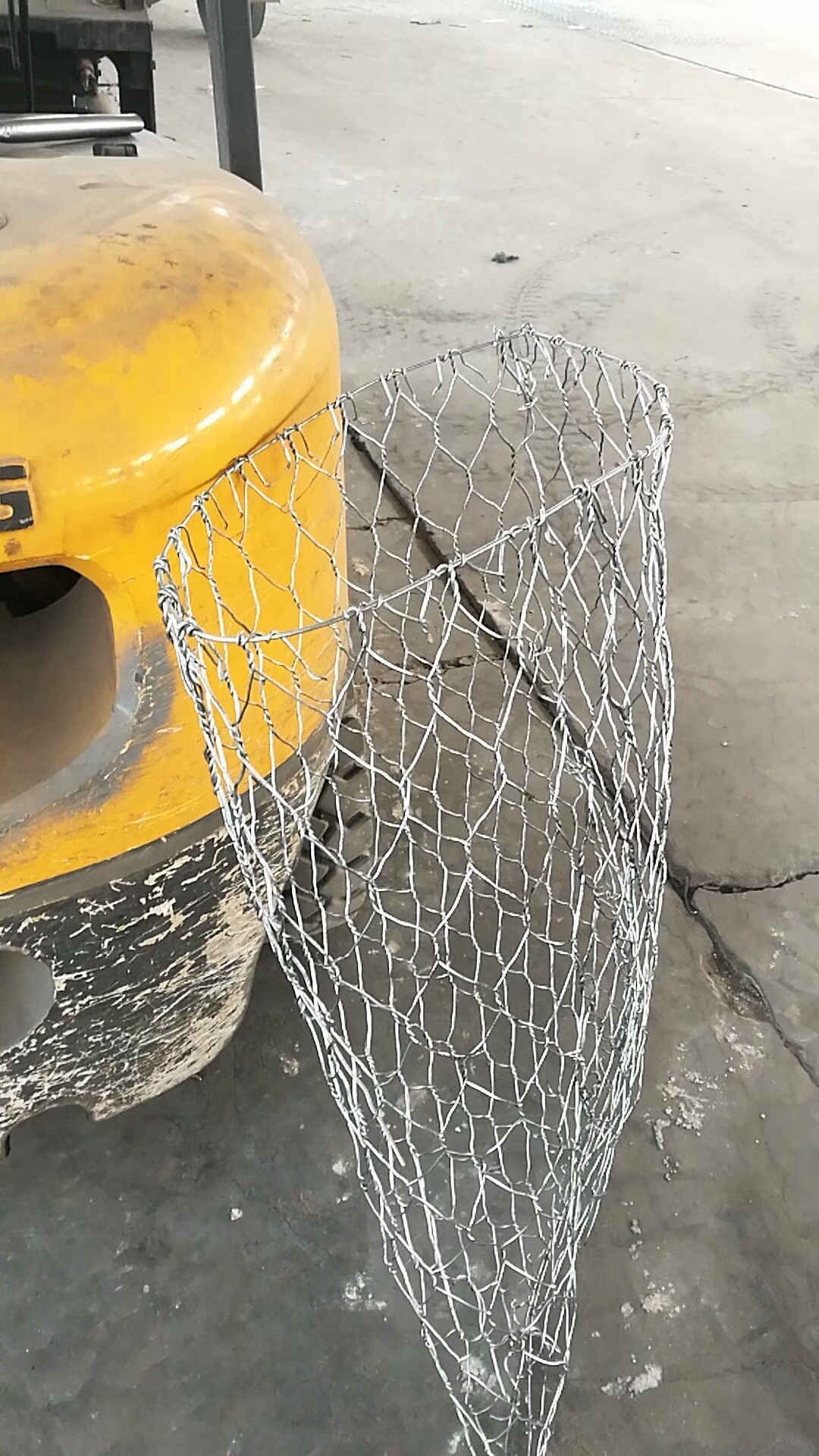 1組裝:將石籠網(wǎng)兜置于平實的地面展開,壓平多余的折痕,沿一側(cè)面螺旋旋轉(zhuǎn)成圓柱體,并用綁絲扎緊兩端。