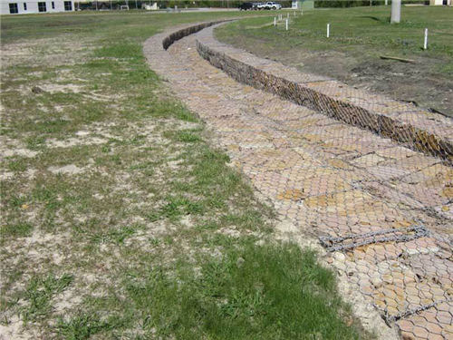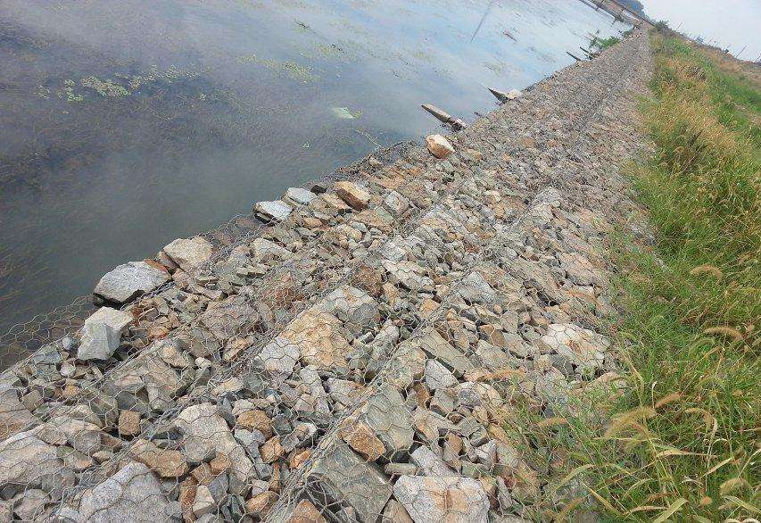 雷諾護(hù)墊是指由機(jī)編雙絞合六邊形金屬網(wǎng)面構(gòu)成的厚度遠(yuǎn)小于長(zhǎng)度和寬度的墊形工程構(gòu)件,其中裝入塊石等填充料后連接成一體,成為主要用于水利堤防、岸坡、海曼等的防沖刷結(jié)構(gòu),具有柔性、對(duì)地基適應(yīng)性的優(yōu)點(diǎn)。