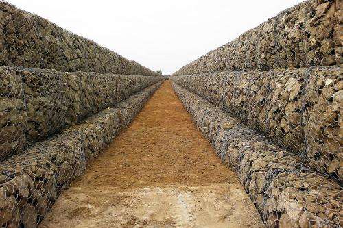 (十一)填充石料時(shí)應(yīng)先填充一半高度(對(duì)綠濱墊先填充一半厚度),用人工將石料擺放整齊,并用細(xì)石填縫密實(shí),再填充另一半,以保證箱體內(nèi)填充石料的密實(shí)和平整。為避免由于單邊裝填引起隔板變形,緊靠隔板兩邊的石頭必須同時(shí)進(jìn)行裝填。在斜坡上施工時(shí),應(yīng)從坡地向坡頂進(jìn)行裝填,并確保每個(gè)隔板的頂部都露出來,便于封口絞合。