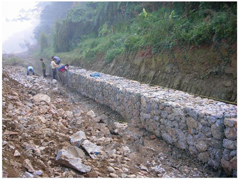 (5) 較好的柔韌性。石籠網(wǎng)片的原材料可采用涂膜熱鍍鋅低碳鋼絲,構(gòu)成網(wǎng)格的鋼絲有一定的強(qiáng)度,不易被拉斷,箱籠整體強(qiáng)度較高。低碳鋼絲承受適度的變形特點(diǎn),可以將全部工程連成整體,不需分縫,即使由于某種原因使結(jié)構(gòu)中斷裂一根網(wǎng)絲,也不會影響結(jié)構(gòu)的整體性。特別在受地基土沉陷或墻后土有小的變形影響時(shí),結(jié)構(gòu)能進(jìn)行自身適應(yīng)性的微調(diào),不會因不均勻沉陷而產(chǎn)生沉陷縫等,整體結(jié)構(gòu)不會遭到破壞。