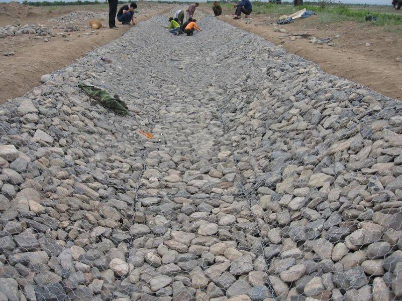 固濱籠具有固堤防沖刷的作用, 固濱籠工藝是指將特種鋼絲由專用機(jī)械編織成雙絞、蜂巢形網(wǎng)目的格網(wǎng)片,根據(jù)工程設(shè)計(jì)要求,裁剪、設(shè)計(jì)、組裝成箱籠并裝入塊石等填充料后連接成一體的結(jié)構(gòu),用作提防、路基防護(hù)工程。