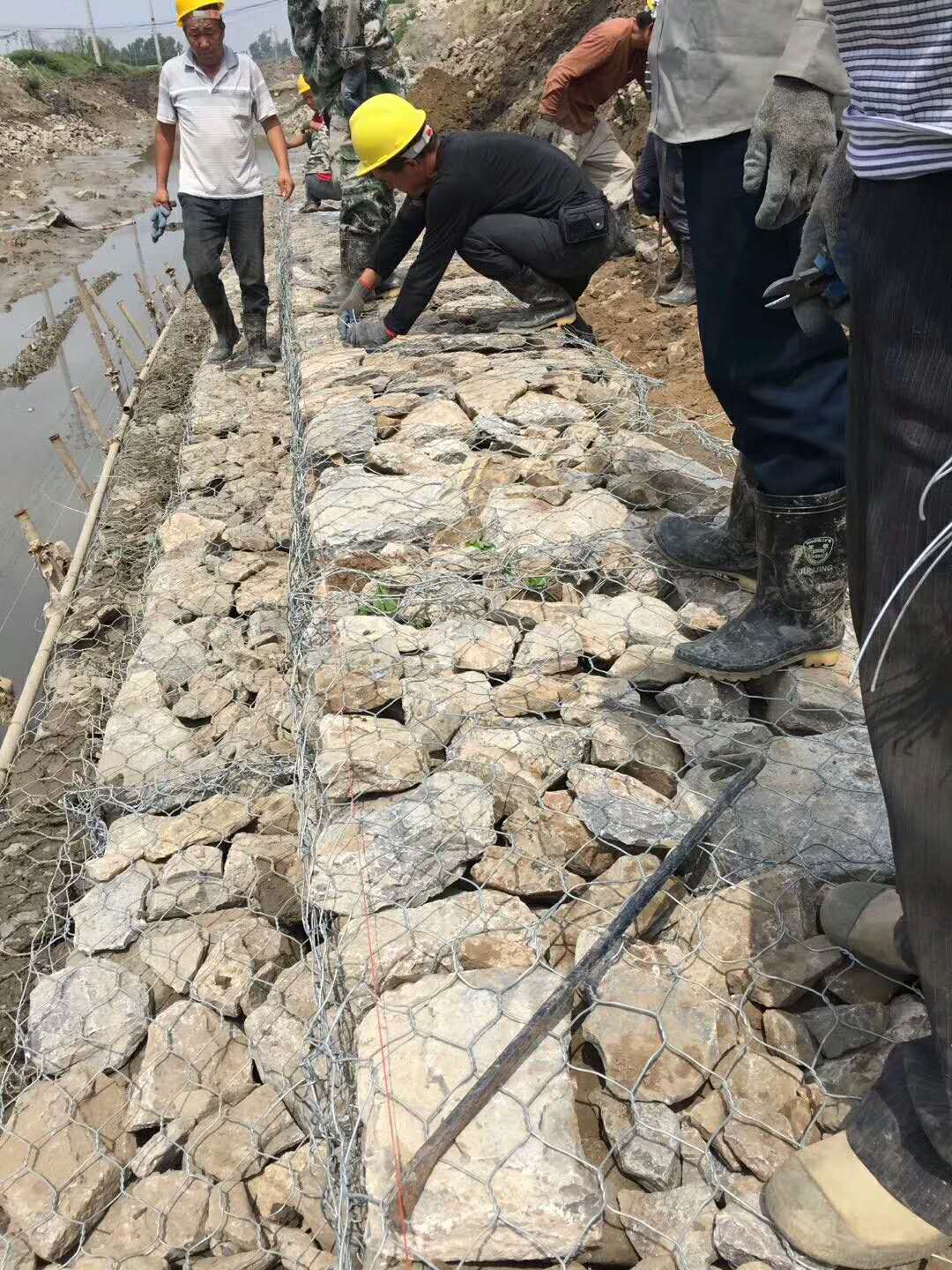 (2)將組裝好的籠體安裝在所需的位置上,并與相鄰的籠體綁扎連接,將準(zhǔn)備好的石塊或卵石填入籠中,要作適當(dāng)?shù)拇a排,以達(dá)到較高的密度,石塊直徑一般需大于網(wǎng)目的兩倍,石塊要選用抗風(fēng)化能力強(qiáng)的石料。用拉筋來(lái)保持籠體形狀的規(guī)整,拉筋間距一般在300mm左右。石塊填充完畢后,蓋上籠蓋,整齊籠子邊緣,并綁扎連接,如采用分體式籠蓋,則需等全部籠子填充完后再鋪設(shè)籠蓋,并沿籠體和隔片邊緣依次綁扎,可根據(jù)實(shí)際情況對(duì)籠體進(jìn)行覆土綠化。