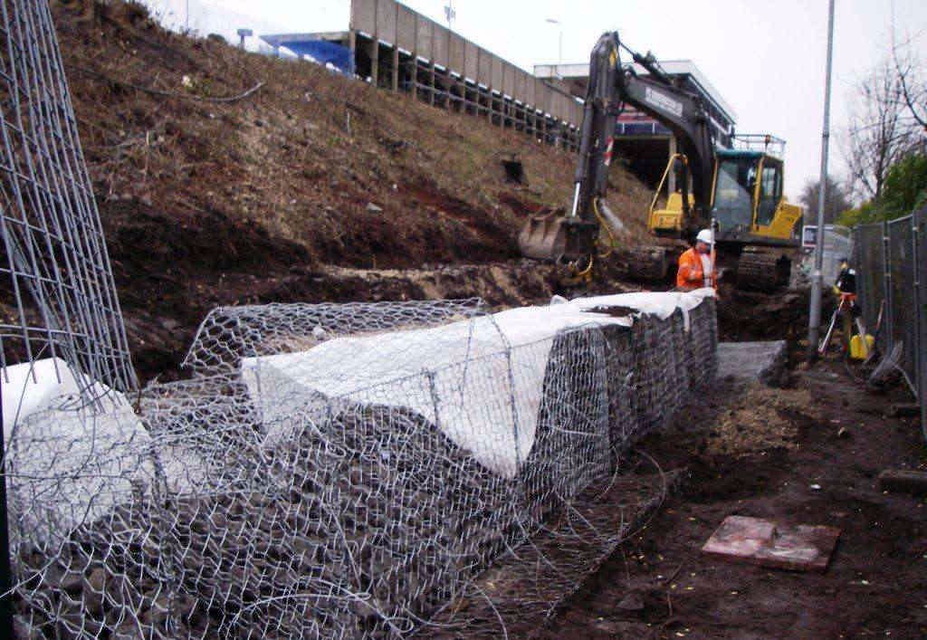 (2)將組裝好的籠體安裝在所需的位置上,并與相鄰的籠體綁扎連接,將準(zhǔn)備好的石塊或卵石填入籠中,要作適當(dāng)?shù)拇a排,以達(dá)到較高的密度,石塊直徑一般需大于網(wǎng)目的兩倍,石塊要選用抗風(fēng)化能力強(qiáng)的石料。用拉筋來(lái)保持籠體形狀的規(guī)整,拉筋間距一般在300mm左右。石塊填充完畢后,蓋上籠蓋,整齊籠子邊緣,并綁扎連接,如采用分體式籠蓋,則需等全部籠子填充完后再鋪設(shè)籠蓋,并沿籠體和隔片邊緣依次綁扎,可根據(jù)實(shí)際情況對(duì)籠體進(jìn)行覆土綠化。