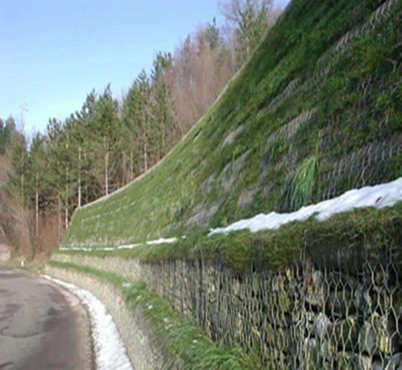 格賓石籠是格賓箱內(nèi)填滿適當(dāng)尺寸的毛石或塊石構(gòu)成。格賓網(wǎng)箱通過六張采用高強(qiáng)度的鍍鋅低碳鋼絲由機(jī)械編織成的雙絞六角形鋼絲網(wǎng)拼成。鋼絲由錘煉過且熱鍍鋅以符合國際標(biāo)準(zhǔn)的軟鋼所做成,雙絞六邊形網(wǎng)及高品質(zhì)的鍍鋅網(wǎng)線決定了格賓網(wǎng)箱的優(yōu)良品質(zhì)。雙絞方式將線綁在一起形成網(wǎng)狀物,如此即使一兩條線斷了,網(wǎng)狀物也不會(huì)被解開。鍍鋁、鋅保護(hù)網(wǎng)線長期免于氧化的作用