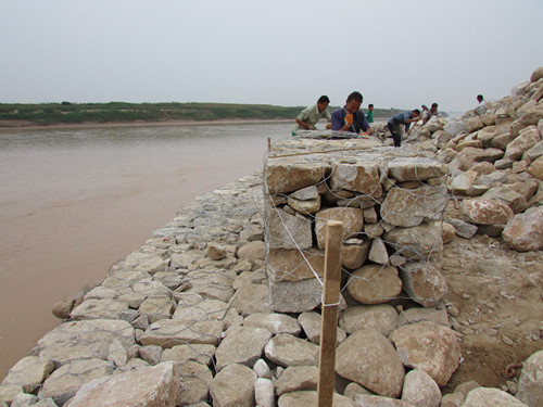 5.放置 綁好后,用機(jī)器小心將石籠網(wǎng)一個(gè)一個(gè)或兩個(gè)兩個(gè)的吊放到恰當(dāng)位置。為了保證質(zhì)量,石籠網(wǎng)縫邊、組裝時(shí)應(yīng)用較粗的邊絲和綁絲。